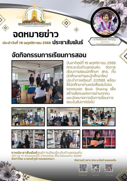 วันอาทิตย์ที่ 16 พฤศจิกายน 2568 ศกร.ระดับตำบลดอนหัน จัดการเรียนการสอนนักศึกษา สกร. ทั้งนักศึกษาเก่าและนักศึกษาใหม่ ประจำภาคเรียนที่ 2/2568 พร้อมให้นักศึกษาอ่านหนังสือเล่มโปรดของตนเอง Book Sharing เพื่อสร้างสังคมแห่งการอ่านทุกคน และนัดหมายการจัดการเรียนการสอนในสัปดาห์ต่อไป
